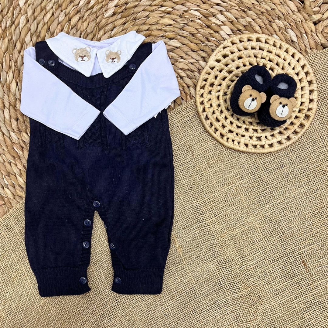 Kit Jardineira Tricô com Body Gola Bordada Madri + Sapatinho Tricô Antialérgico