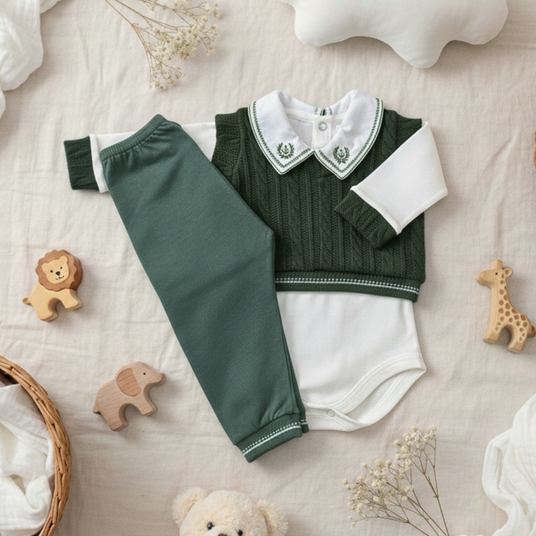 Composto por body de manga longa, calça sem pé e suéter com gola bordada, é uma escolha perfeita para maternidade, primeiros passeios e para compor um enxoval de alto padrão.
