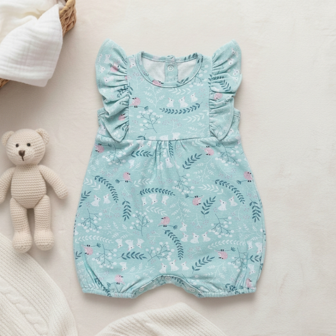 O modelo possui mangas com babadinhos, cintura levemente marcada e caimento soltinho, garantindo liberdade de movimentos e conforto ao bebê. Conta com fechamento em botões de pressão na parte inferior, facilitando a troca de fraldas no dia a dia.